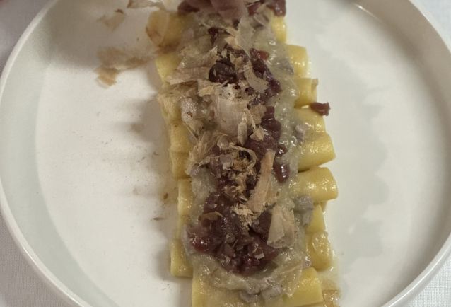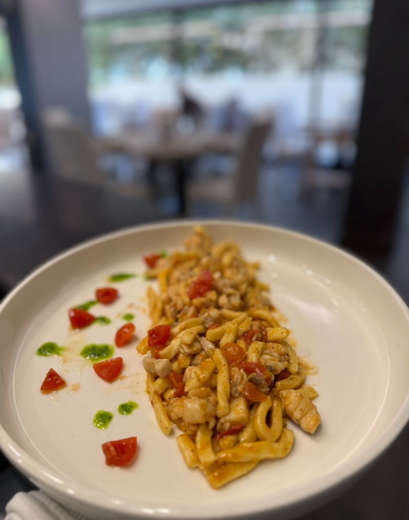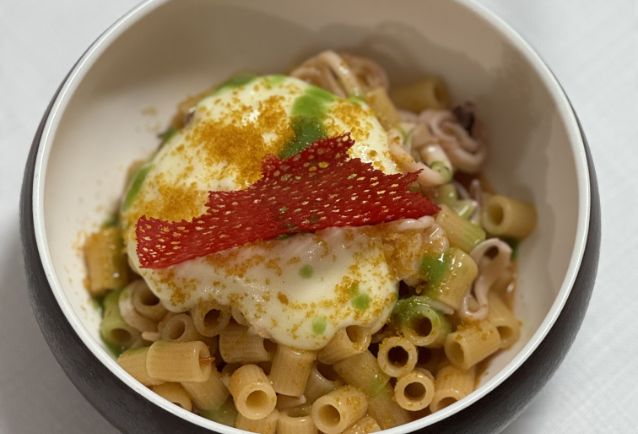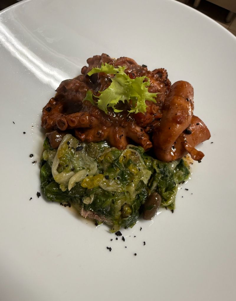 - Baccalà in crosta di cornflakes, scarola, mayo alla Colatura di Alici e polvere di olive / - Polpo alla Nerano con crema di zucchine, salsa di provola e basilico / - Crumble di Fresella, crudo di gambero, stracciatella, indivia riccia, zenzero e limone