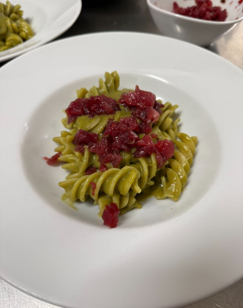 - Ripieno, vellutata di piselli, il suo nero e guanciale croccante